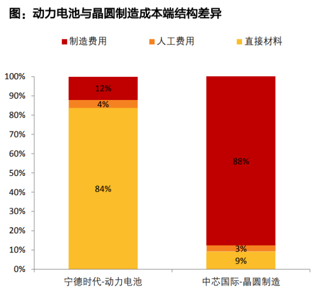 对比同一产业位置的晶圆制造可以发现,宁德时代的成本结构中超过80%都是直接材料费,人工和制造费用降低空间极小,而中芯国际的直接材料费仅为9%。