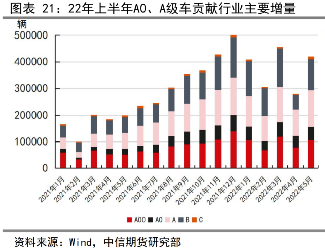如上图所示,2022年1-5月,A级车销58.0万辆,同比增长157%;B级车销55.0万辆,同比增长112%,增速均超过了A00级车。所以,磷酸锰铁锂的装机量或将极大受益于这一趋势变化。